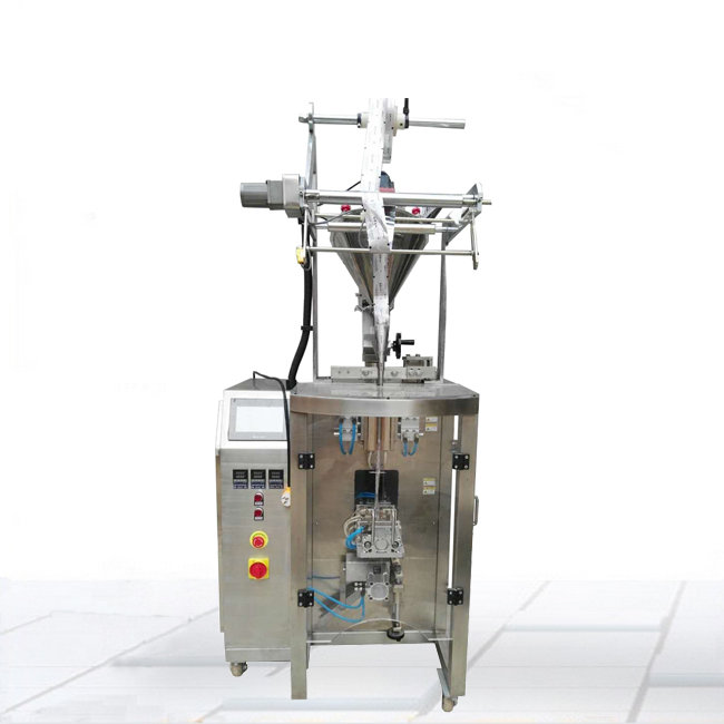 立式烧烤料五香粉食品包装机整体下料机构采用纵向调节装置,螺杆套与料斗之间选用锁紧扣方式连接,无需任何工具便可快捷的清理剩余物料。